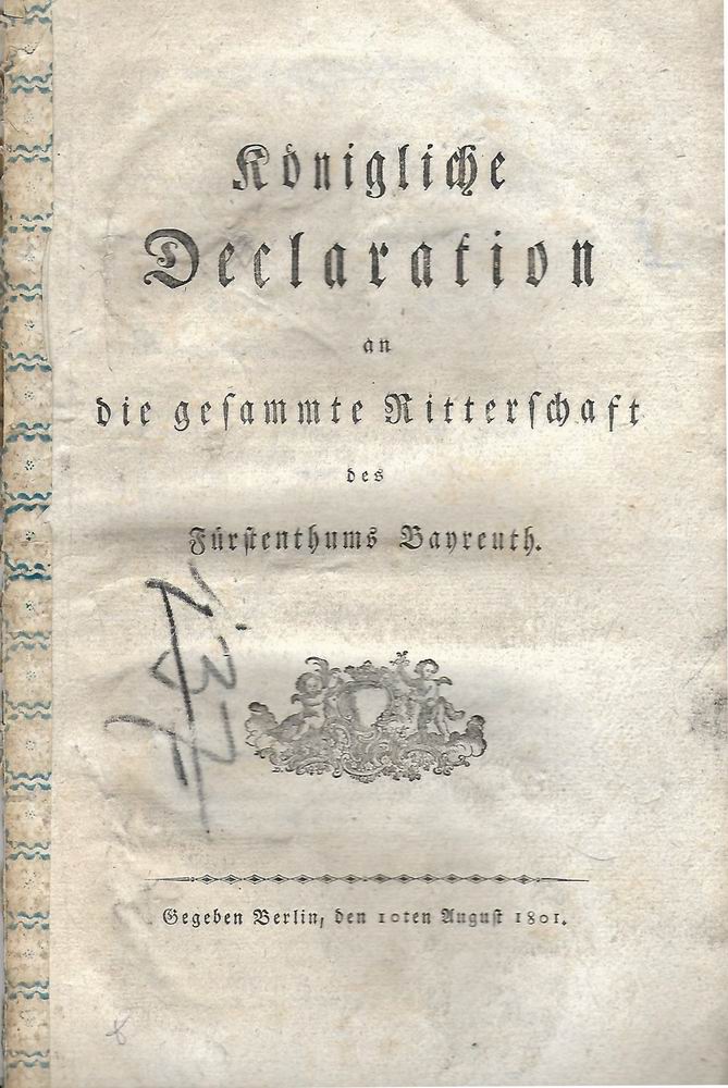 „Königliche Declaration an die gesammte Ritterschaft des Fürstenthums Bayreuth“ regelt in 140 Artikeln die „Verhältnisse der Bayreuther Ritterschaft“ in Korporations-, Religions- und Kirchen-, Justiz-, Militair-, Regalien-, Lehens- und Polizeisachen.