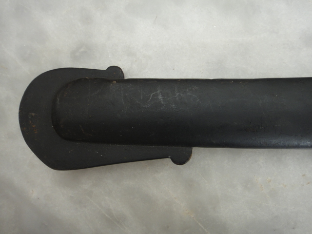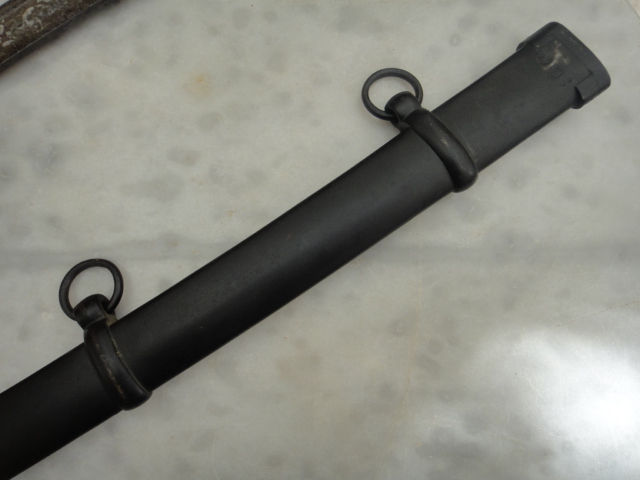 Die Scheide ist sehr schwer und wuchtig mit geradem Rücken und trägt unter dem Mundblech einen Truppenstempel.