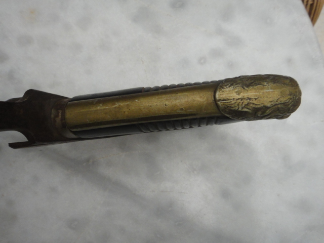 Danke für eure Ausführungen.ich habe das Gafäß nochmal abgelichtet.Griffrücken ist Messing,der rest aus Eisen.Das innere Griffstück ist in der Tat eine Art Kunststoff(bakelit?).Wenn das Stück eh eine zusammengefummeltes Teil ist,könnte man ihn auseinanderbauen.