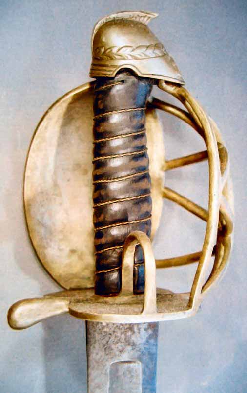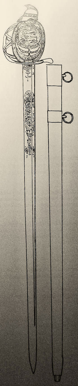 hier mit dem Wappen der Insel Fünen. Gefäße mit 7 verschiedenen Wappen sind bekannt. Gefäß aus Tombak, Griff beledert mit Messingdrahtwicklung. Einschneidige Klinge mit schmaler Rille und vielen verschiedenen gravierten und vergoldeten Elementen. Klinge des gezeigten Degens wahrscheinlich nicht original. Scheide aus braunem Leder mit zwei beweglichen Trageringen und Messingbeschlägen. Länge: 102,4 cm (Foto: Felsen). Drittes Bild ein M 1780 mit schleswiger Wappen (bestimmt für das schleswiger Reiterregiment), Originalklinge und Scheide.