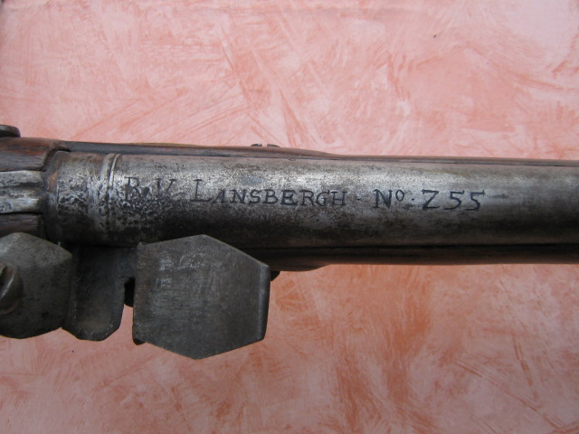 Der auf dem Schlossblech eingravierte Hersteller hat - nebenbei bemerkt - im Jahr 1745 Kavalleriepistolen nach Kurköln geliefert. Das Schlossgegenblech kommt in dieser charakteristischen Form oft in den Niederlanden vor, auch könnte die Regimentsangabe auf Holland deuten, doch kann ich ein solches Regiment weder in Holland noch im Reich verifizieren.