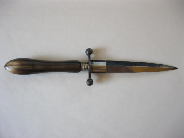 Normalerweise hätte ich diesen kleinen Dolch, als Brieföffner bezeichnet.Durch den Artikel von Olaf Michels dürfte es wohl ein Hurendolch sein.Der 19,5cm lange Dolch besitzt weder Firmen noch andere Stempel,somit kann man schlecht sagen woher er kommt.Die Schönen der Nacht verwahrten diese Objekte in einer teilweise sehr einfach gestalteten Scheide im Strumpfband od.an einem anderen Ort.