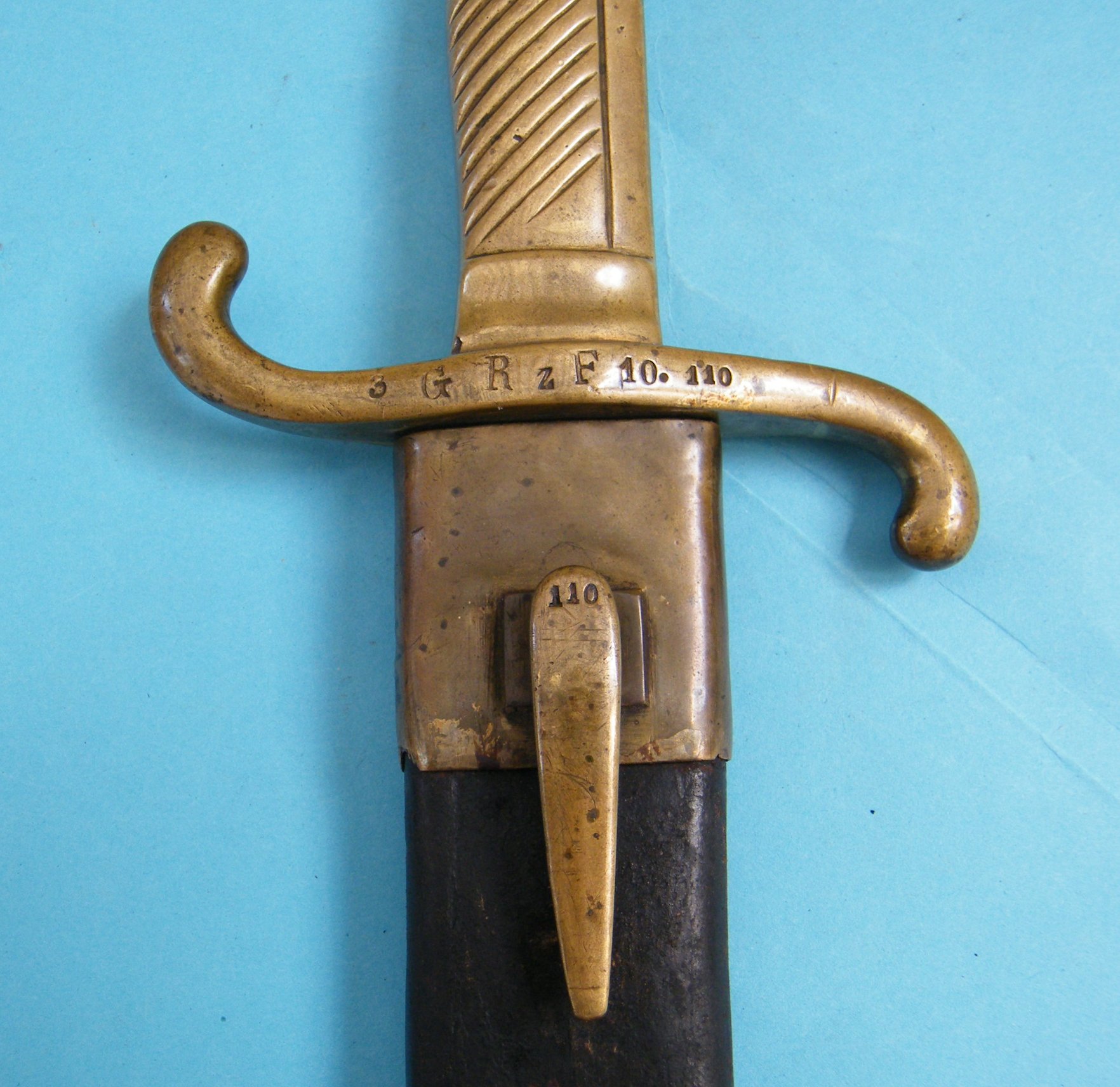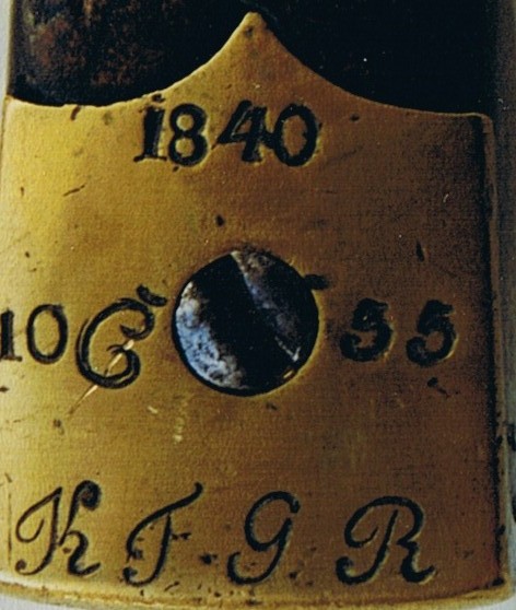 Warum nicht wie üblich die komplette Wiederholung der Stempel auf der Scheide? Siehe oben, wobei dies für den Zeitpunkt um 1864 doch sehr ungewöhnlich ist (da die Deckplatte fehlt, ist das Mundblech vom Säbel ohne Stichblatt übernommen). Die Scheide dürfte somit eine spätere Ergänzung sein, wobei ich den Zeitraum „später“ nicht festlegen möchte.