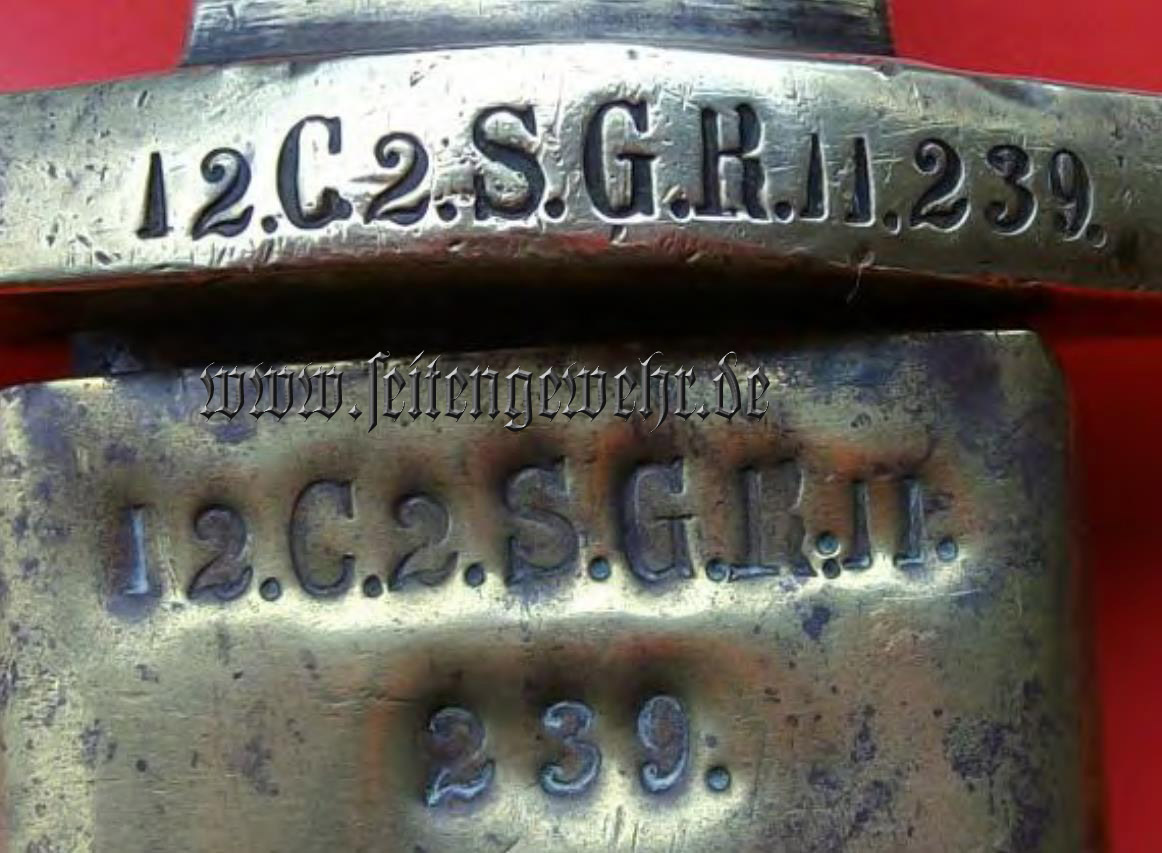 Das 3. Garde-Regiment zu Fuß wurde am 5. Mai 1860 errichtet und ab dem 4. Juli 1860 als solches bezeichnet. Als Neuformation sollte es lt. Gohlke (s. unter „Literatur-Blankwaffen“, dortige S. 79) dabei den Säbel ohne Stichblatt erhalten haben. Von einem solchen könnte die Klinge (Stempel „FW 54“) stammen, während die Garde-Infanterie ansonsten vorschriftsmäßig Säbel mit Stichblatt trug.