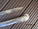 Einschneidige Klinge mit breitem Hohlschliff, Pandurenspitze. Eisengefäß, Griff beledert, in den Rillen Messingdrahtwicklung. Eisenscheide mit zwei beweglichen Trageringen und asymmetrischem Schleppblech (Fotos: Felsen).