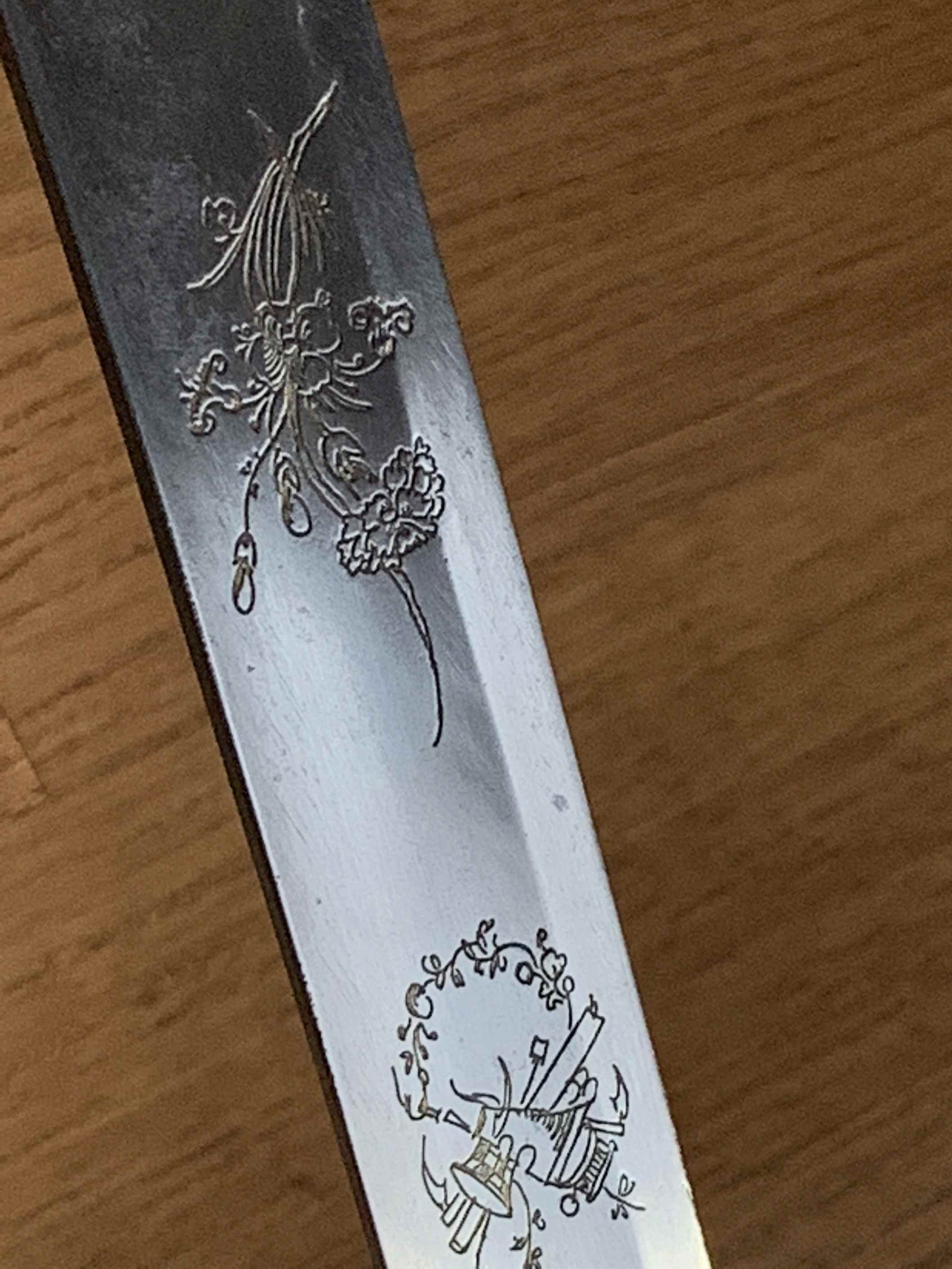 Viel misstrauischer wäre ich bei absolut gleichmäßigen Linien auf Klingen dieser Zeit. In solchen Fällen kann man dann getrost von einer "Laser-Gravur" ausgehen.