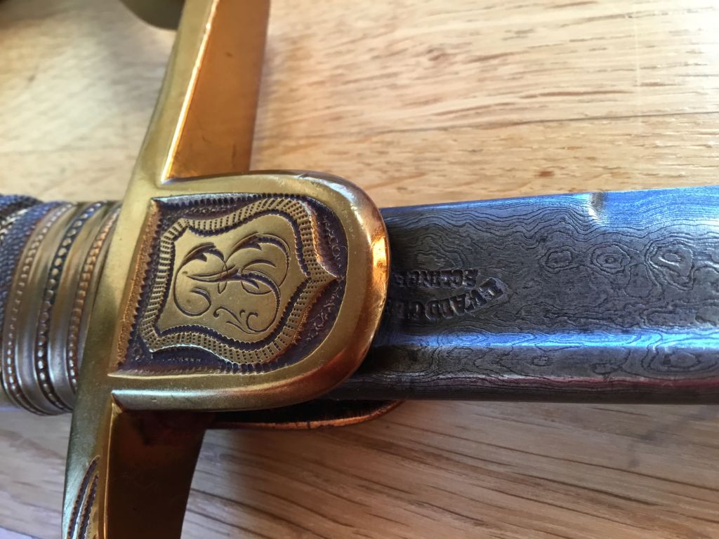 Es handelt sich um einen Artillerieoffizier-Säbel von Ewald Cleff aus Solingen mit Damastklinge und der Inschrift: