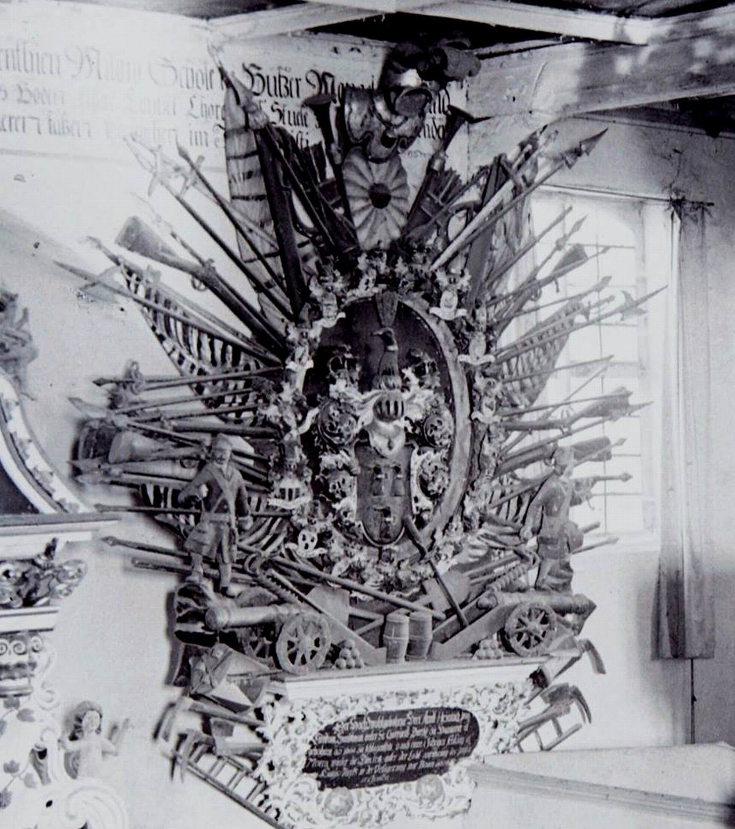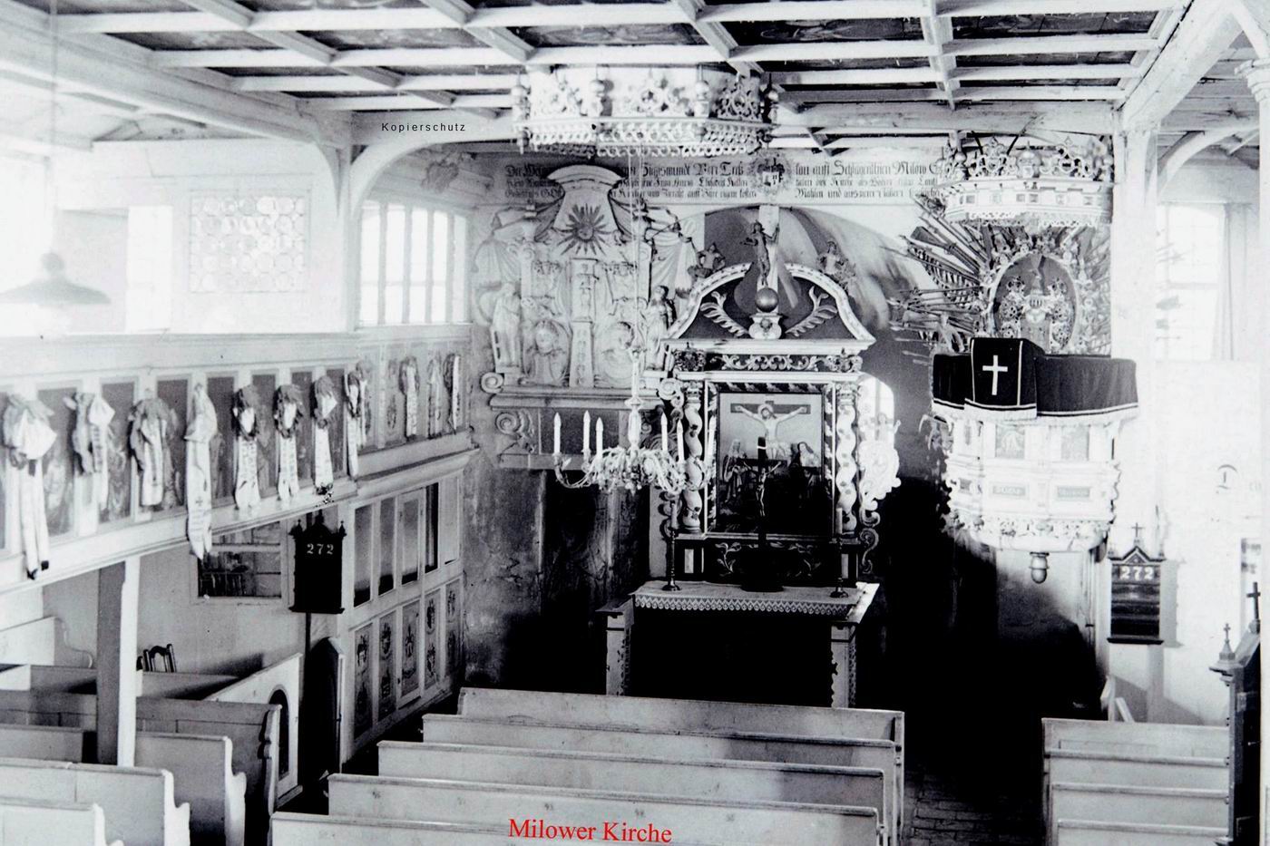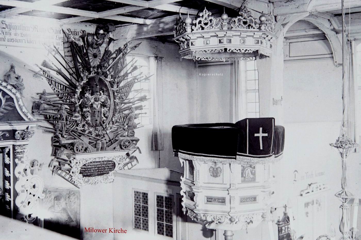 Hier sind die mir zur Verfügung gestellten Fotos von der Milower Fachwerkkirche, 1695 erbaut durch einem von Tresckow. Die aktuelle Beschreibung des Innenraumes enthält das auf den Fotos zu sehende Panoplie nicht mehr. Ich selbst war dort noch nicht drin. Es ist nicht die Kirche, wo wir letztes Jahr beide drin waren. Dort hing "nur" eine Steintafel von der Stiftung durch Leopold I., Fürst von Anhalt-Dessau. Milow gehörte einst zu Anhalt.