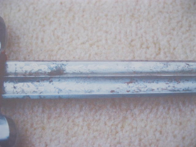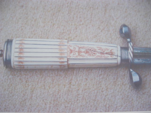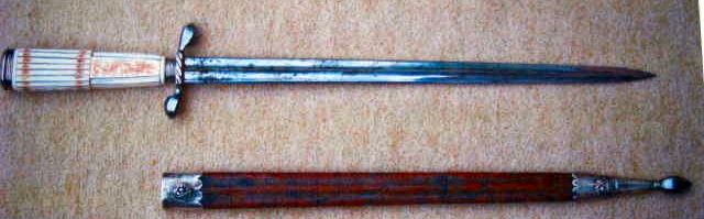 Die Klinge ist der untere Teil einer Degenklinge. Der Griff besteht aus