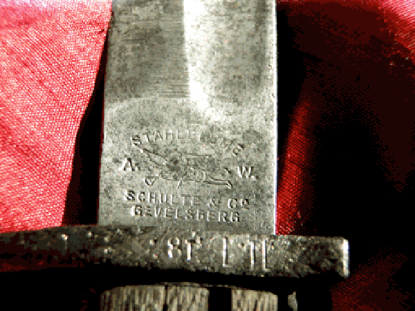 Nun die Frage: war Stahlblume eine Vereinigung von Herstellern, was bedeutet A.W.(bei Sigges Bajo. gibt es eins mitR.K.),wie heist die Truppe? Ein Fragment einer Abnahme ist auf dem Knauf, aber da rostnarbig,nicht eindeutig auszumachen. Eine Scheide hab ich leider nicht dazu.