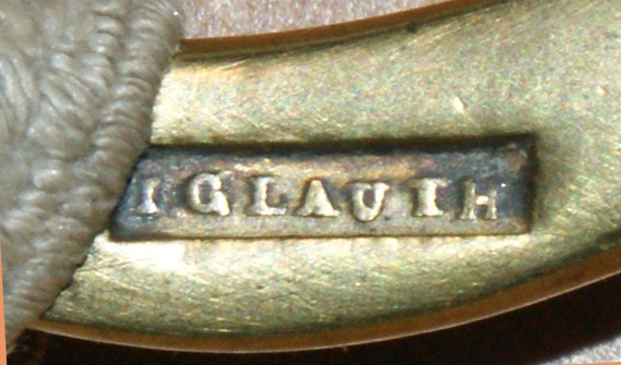 Schlagstempel des Schwertfegers J(Jacob) Glauth auf der Quartseite (innen) des Griffbügels. Der Stempel taucht ebenfalls bei einem Kavallerie-Offizier-Säbel terzseits am Griffbügel auf.