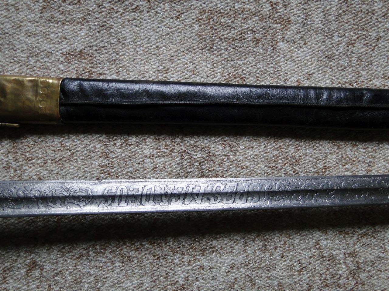 Der Griffkorb besteht aus Messing, Die Hilze wohl aus Kunststoff mit 3facher Messingdrahtwicklung (1mal dick gedreht u. 2mal dünn glatt).Die klinge ist einschneidig mit Mittelspitze und je 1er runden Hohlkehle. Sie ist beidseitig geätzt mit floralem Muster und lat. Inschrift.