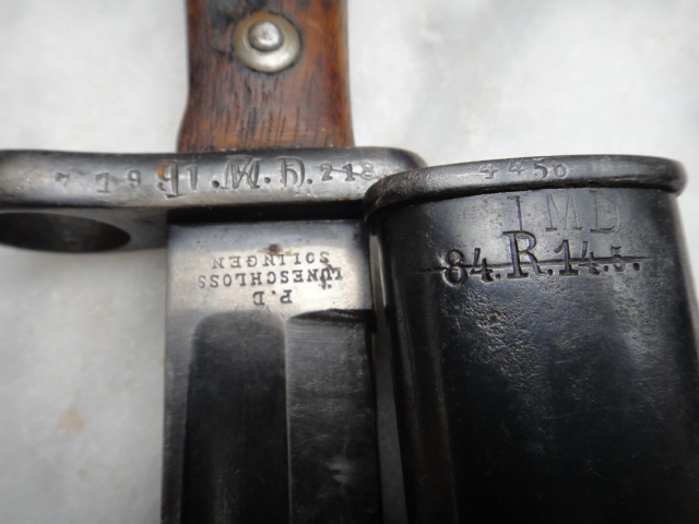 Scheide ist ebenfalls vom IR 91, allerdings nicht nummerngleich und ohne Stempel der Marine. Daher wohl später von Sammlern zusammengeführt.
