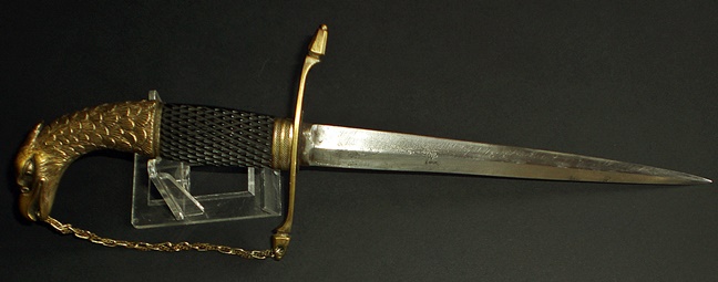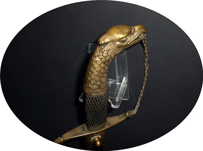 Der Adlerkopf, die Verbindungskette zur Parierstange, der Griffring und die Scheidenbeschläge sind aus Messing gefertigt. Das Griffstück mit Rautenmuster, aus Ebenholz.