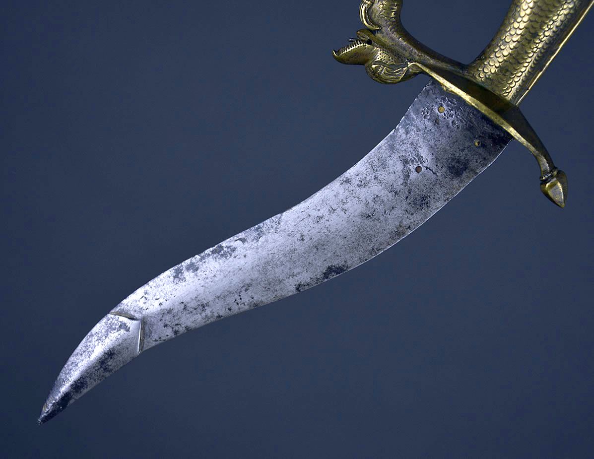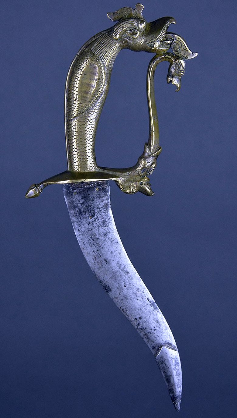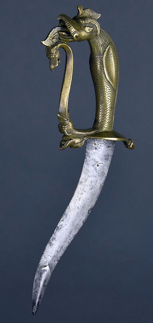 Der Dolch hat generell eine doppelt geschwungene Klinge mit zweiseitiger Schneide. Das Griffstück, beim gezeigten Stück aus Gussmessing, besteht meist aus einem hochovalen Ring in den die Hand eingreifen kann.