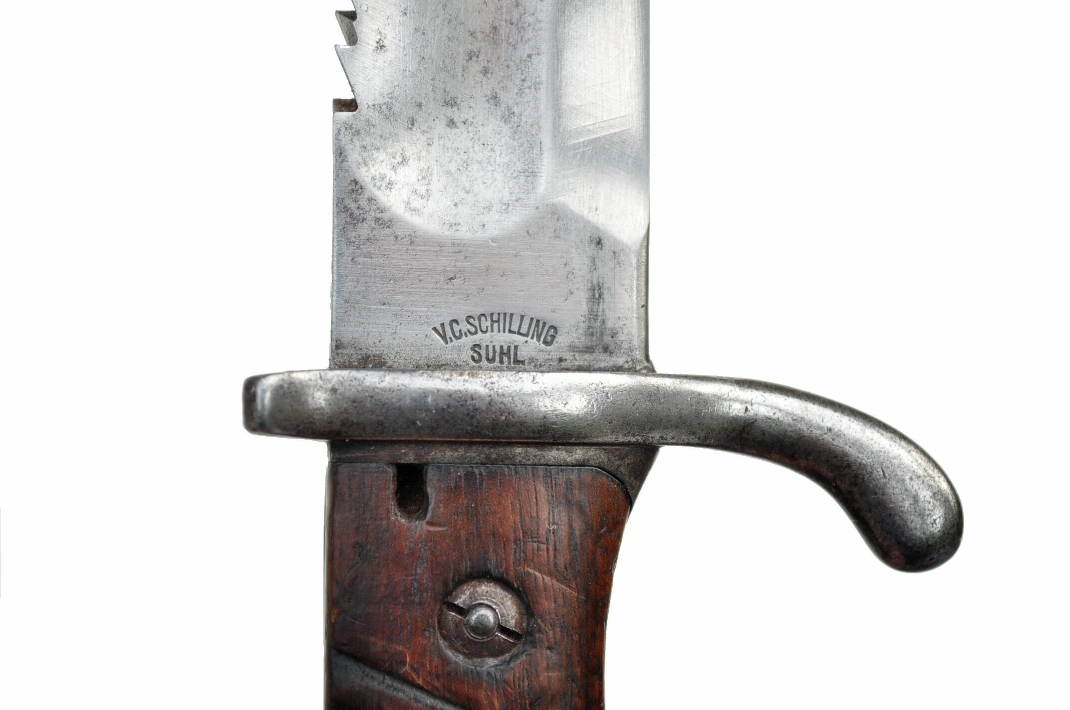 Abnahmestempel auf Klingenrücken, Parierstange klingenseitig, Angel, Haltestiftmutter,