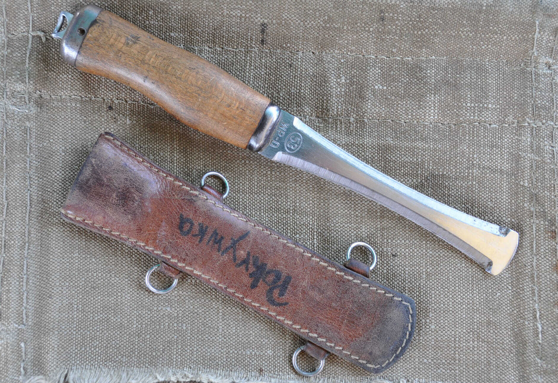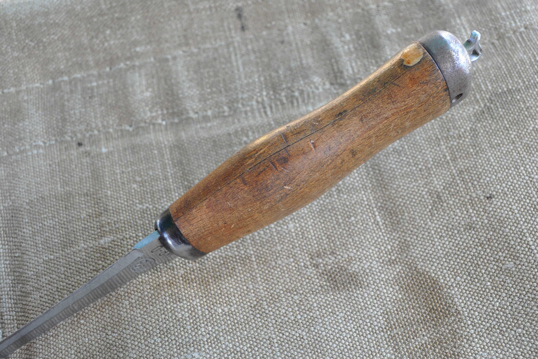 Bei frühen Stücken ist der Griff durch zwei Messingniete mit der Klinge verbunden.