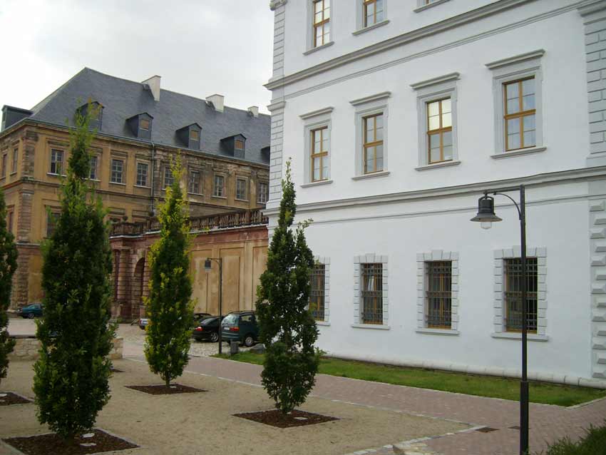 Durch die Hintertür: Der Nebeneingang von der Stadtseite. Sowie ein Blick auf die Stadt und Stand der augenblicklichen Sanierung.