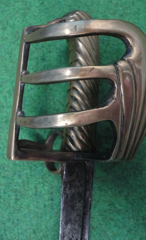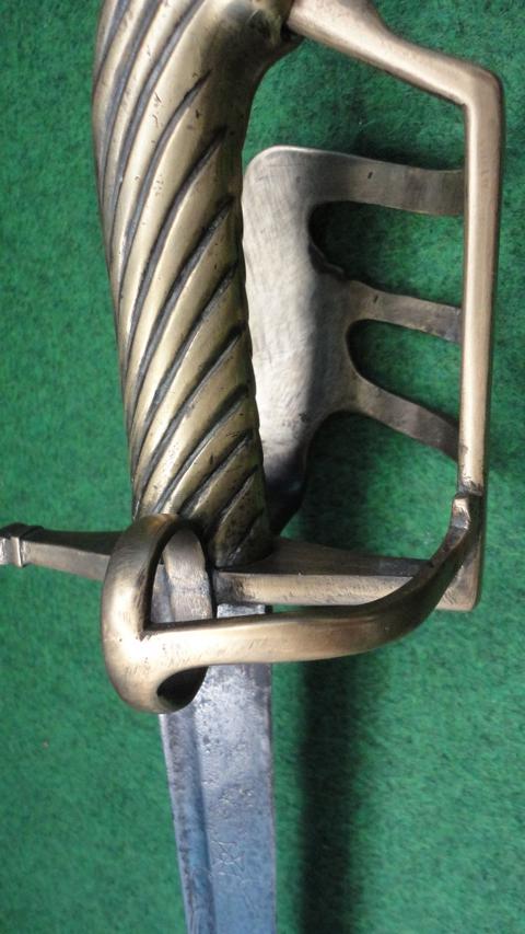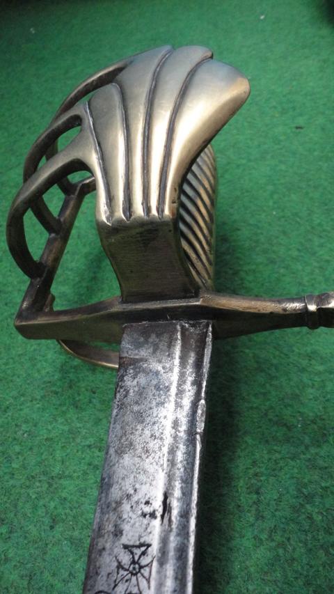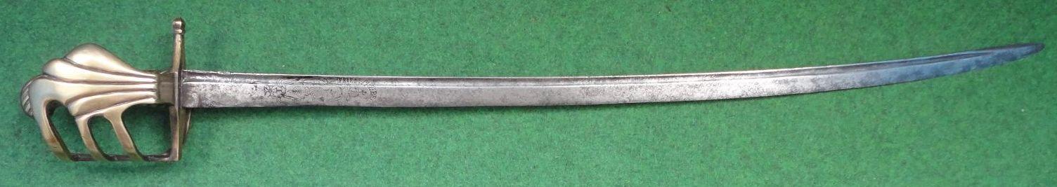 Tombak-Gefäß mit muschelförmigem Knöchelschutz, welcher zwei im Handbügel endende Terzbügel besitzt. Daumenring an der Quartseite. Hilze beidseitig diagonal gerippt, keine Knauf- oder Griffkappe. Gerade Parierstange mit senkrecht darauf stehendem Handbügel. Leicht gebogene Rückenklinge mit beidseitigem Zug und beidseitiger Gravur "bekrönter Adler" umgeben von "