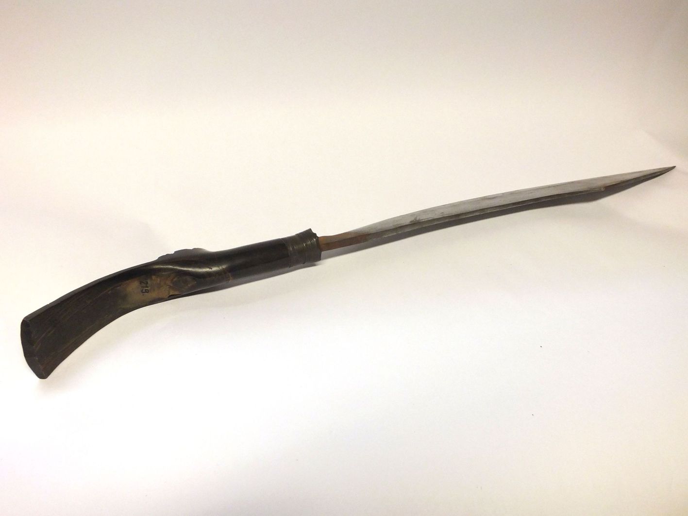 Es handelt sich um eine "Pira", eine säbelähnliche Waffe aus dem 19. Jahrhundert, von den Yakan, welche auf dem Sulu-Archipel leben. Die Yakan taten sich in der Vergangenheit als Krieger, Piraten und Sklavenhändler hervor. Die Kolonialmächte Niederlande, Spanien und USA brachten diese Blankwaffen als Geschenke in die westliche Welt.