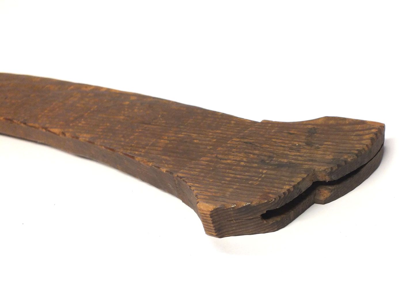 in unserer Einrichtung befindet sich eine säbelähnliche Blankwaffe, über deren Herkunft und Verwendung wir keine näheren Informationen besitzen. Das Exponat (Gesamtlänge: 65,8 cm) kam im Jahr 1961 in unser Haus. Die Klinge (44 cm lang) ist aus Stahl und der Griff aus Horn, umfasst von einem Metallring. Dazu gehört eine Scheide aus Holz.