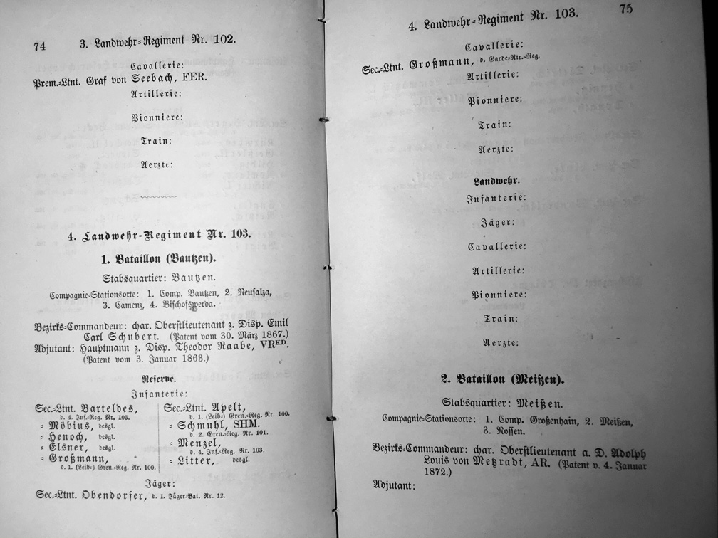Nach dem Gesetz vom 24. Dezember 1866 über die Erfüllung der Wehrpflicht wurden 4 als provisorisch bezeichnete Landwehr-Bataillone in Sachsen aufgestellt. In den Jahren 1868/69 erfolgte dann die endgültige Formierung der Landwehr in 8 Regimentern 100 bis 107 a 2 Bataillone, sowie das Reserve-Landwehr-Bataillon Nr. 108. Insgesamt also 17 Bataillone.