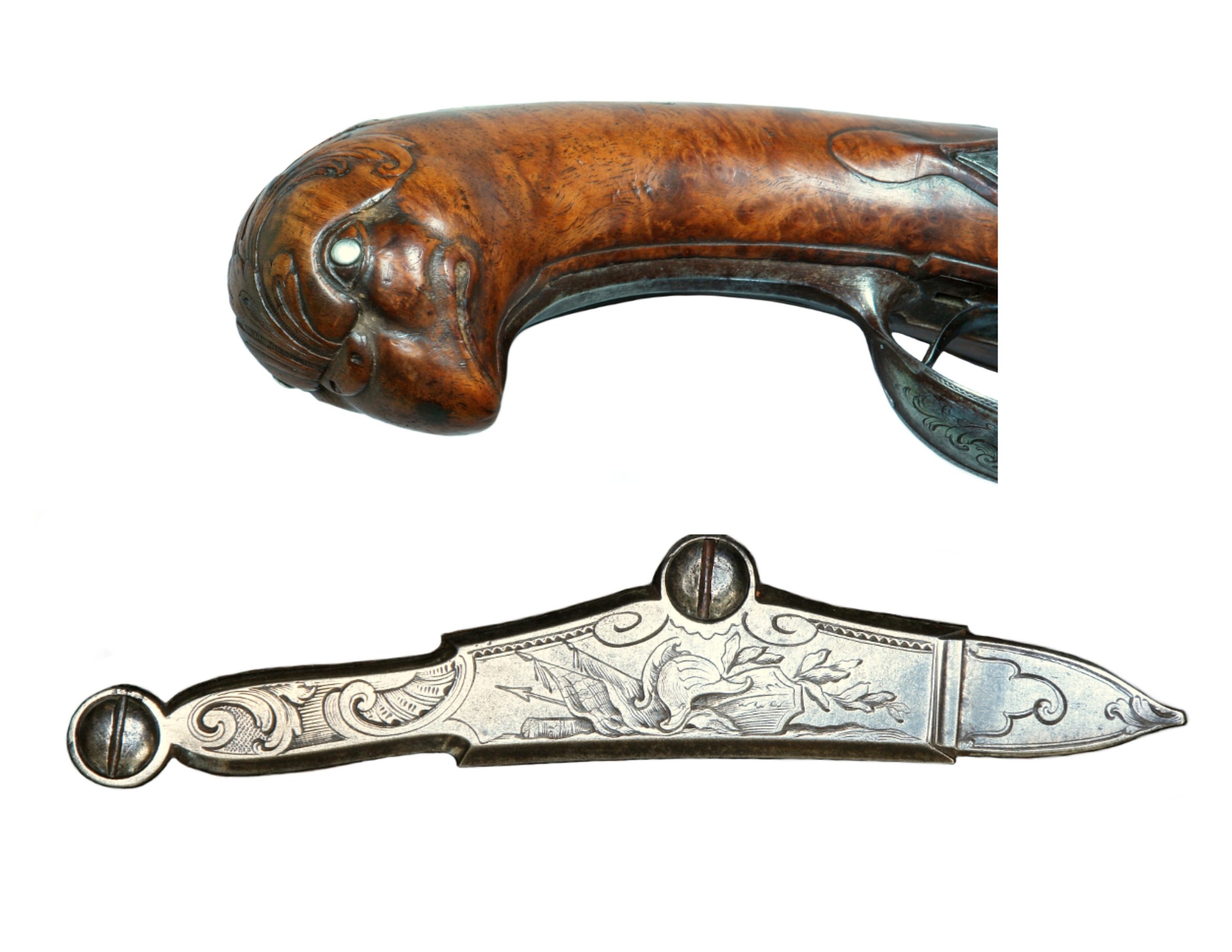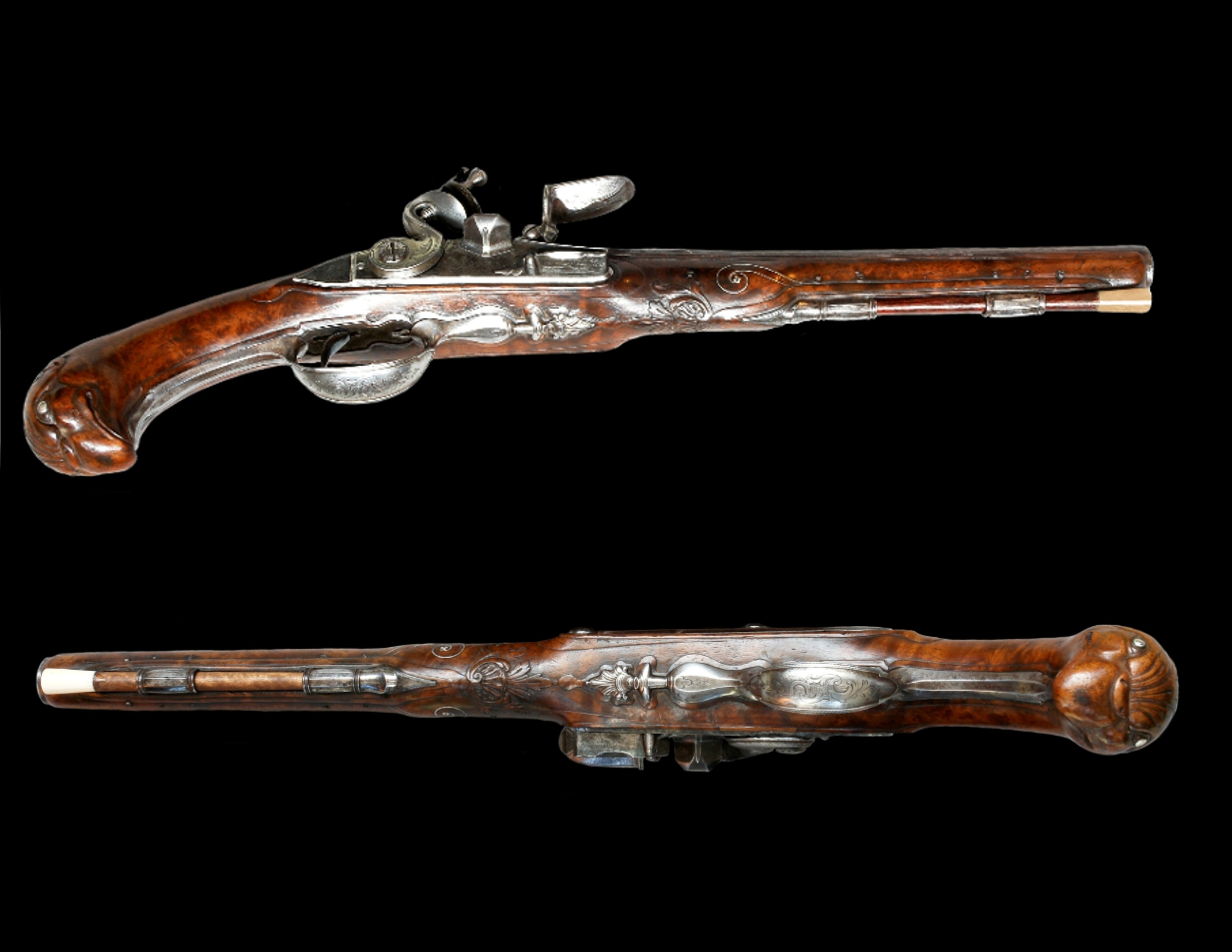 Le Lorain( auch Le Lorraine) aus der Stadt Valence war in Frankreich einer der berühmtesten Büchsenmacher des frühen achtzehnten Jahrhunderts . J. F.Haywart schreibt in seinem Buch „Die Kunst der alten Büchsenmacher“, dass er der einzige nicht in Paris ansässige Meister gewesen sei, der es in seiner Kunstfertigkeit mühelos mit der Elite der Konkurrenten in der Hauptstadt aufnehmen konnte. Von ihm stammt ein sehr hochwertiges doppelläufiges Pistolenpaar, das aus dem Besitz von Charles Bonaparte, dem Vater Napoleons. Waffen von Le Lorain erzielen auf Auktionen regelmäßig Höchstpreise. Da Valence, wo nebenbei erwähnt auch der junge Napoleon seine Ausbildung zu Artilleristen erhielt,nicht weit von der spanischen Grenze entfernt war, lag es für Le Lorain nahe, teilweise die Läufe für seine Pistolen von dort zu beziehen. Spanische Läufe genossen damals einen hervorragenden Ruf und waren deshalb sehr begehrt. So befindet sich bei der vorliegenden Pistole auf dem Lauf auch eine in Gold eingelegte Punze mit dem Wappen von Barcelona und den Initialen AN. Die sehr elegante Pistole hat eine Länge von 40 cm Die Besonderheit dieser Waffe ist der kunstvoll verschnittene, mit Silberdraht verzierte und in einem Adlerkopf als Knauf endende Nussbaumschaft. Schloss, Schlossgegenblech und Abzugbügel zeigen sehr hochwertig ausgeführte Gravuren. Der Lauf ist im hinteren Drittel achteckig und läuft dann nach vorne zu rund aus. Eine Besonderheit ist hier das goldgefütterte Zündloch. Der hölzerne Ladestock endet mit einem Elfenbeindopper. Das Kaliber beträgt etwa 13 mm. Die Schlossplatine und der Hahn haben zeittypisch eine flache, nicht gewölbte Oberfläche.