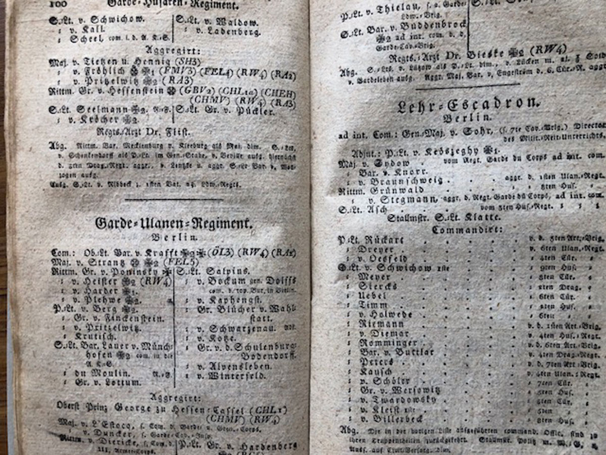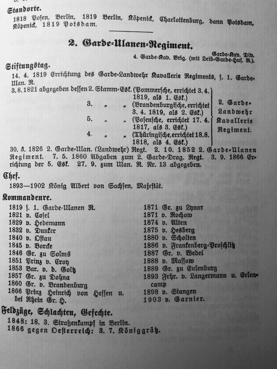 Den Wechsel der nicht für die schwere Kavallerie geeigneten Mannschaften – bei Umformierung 1821 der Garde-Ulanen zu den Garde-Kürassieren – zum neu aufgestellten 2. Garde-Landwehr-Kavallerie-Regiment läßt sich in diesem Zusammenhang nicht beurteilen.