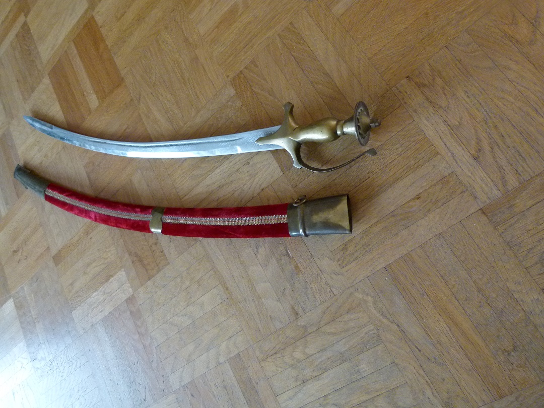 -Und zum Schluss ist auf den letzten beiden Bildern der zweiten Reihe ein indisches Tulwar zu sehen. Ich vermute, dass es sich um eine Replik handelt, da meines Wissens nach nie eine Griffkopfmutter in Form einer Sechskant-Hutmutter verwendet wurden. Die mir bekannten Tulwars haben eine einfache, ungekehlte Klinge wohingegen das deine über eine Klinge mit Hohlkehle verfügt. Zudem wirkt der allgemeine Zustand auf mich wie der einer Neufertigung.