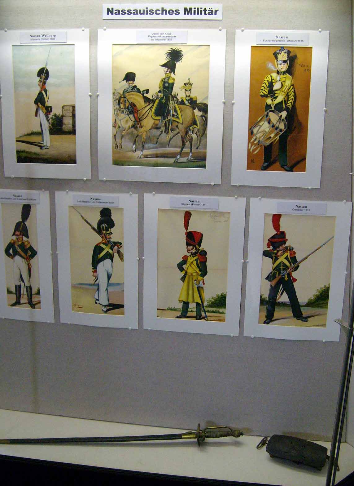 Vitrine I mit einem nassauischen Offizier-Degen und einer Patronentasche.