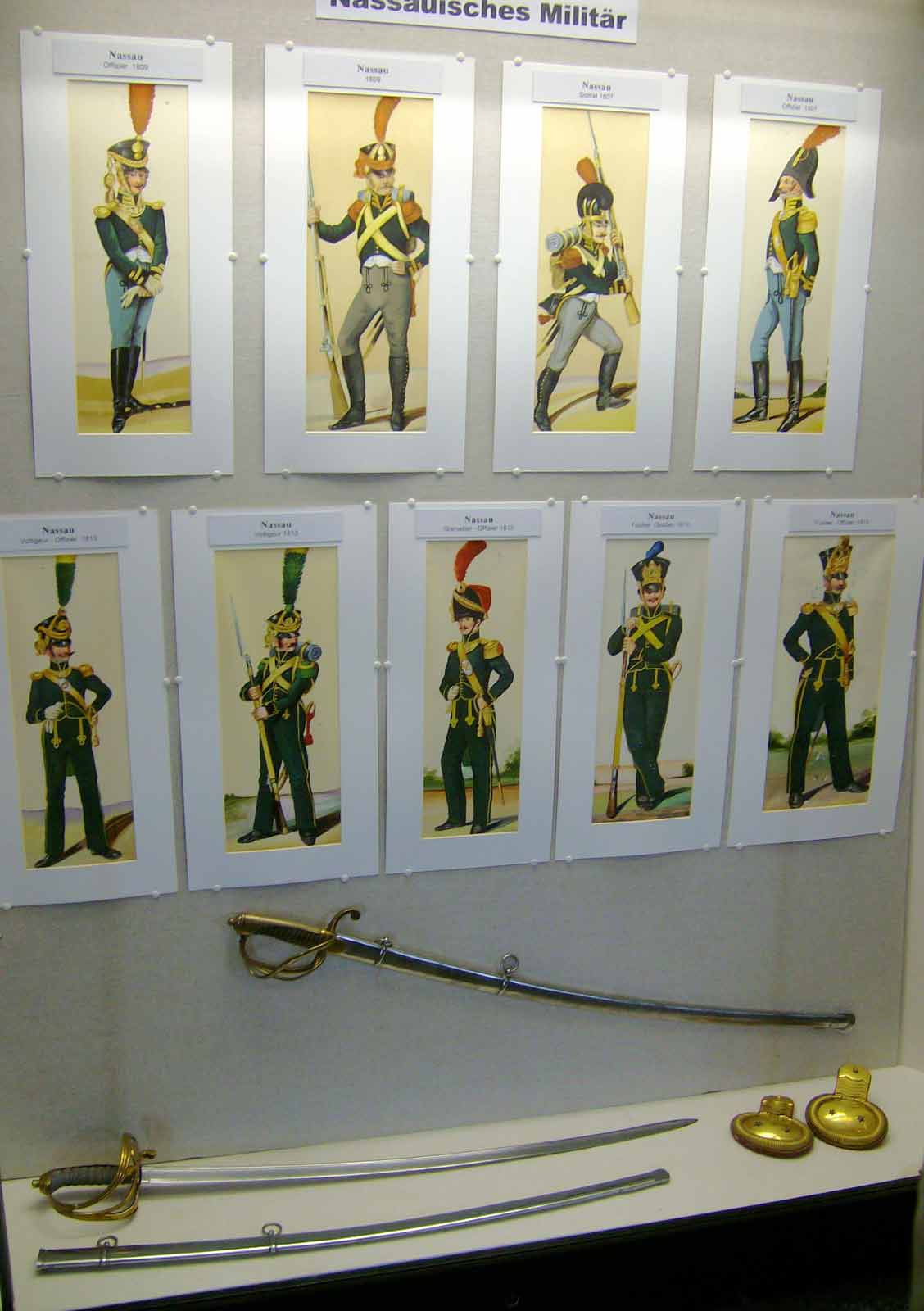 Vitrine II mit den nassauischen Offizier-Säbel von 1849 und die Epauletten.