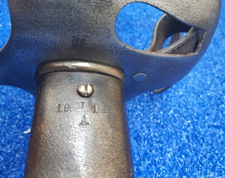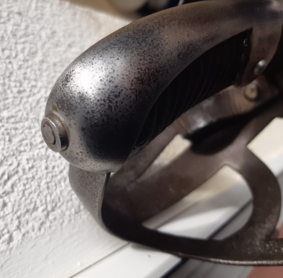 Eine Beurteilung des Alters der Verschraubung nach diesem Bildchen ist schwierig. Man hat das Gefühl, daß die Griffkappe einer größeren Korrosion ausgesetzt war als die Mutter. Und eine Edelstahlmutter im 1. Weltkrieg?