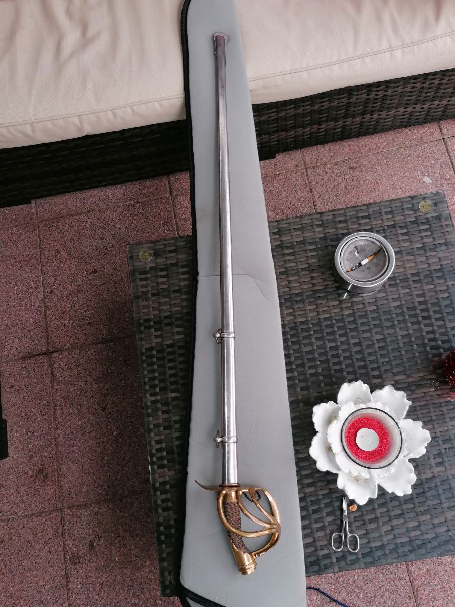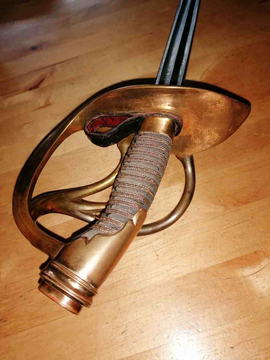 Die Scheide sieht unten blank (korrekt), oben geschwärzt (Lack?, wohl später erfolgt) aus. Wie sieht sie in der Gesamtschau aus? Wie viele Trageringe, bzw. -bänder? Wie sieht die Deckplatte der Scheide aus?