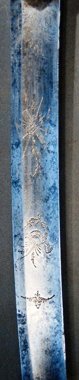 Einschneidige Klinge mit breitem Hohlschliff, Gefäß aus vergoldetem Messing mit Ebenholzgriff. Scheide aus Messing. Es gibt sehr viele Varianten dieses Modells (siehe 1. Foto), auch mit weißen Griffschalen aus Bein und verzierten Scheiden für die Marine. Länge ca. 89 cm.