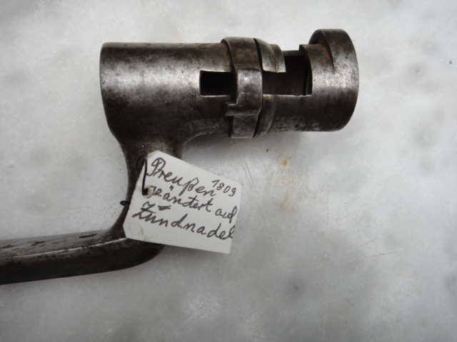 Das hat mit Preußen, soweit ich das sehe, nichts zu tun. Das preußische M 1809-Bajonett hatte einen Exzenterring und wurde nicht mittels Warze und Sperr-Ring befestigt, sondern mit Hilfe eines Federhakens unter dem Lauf, siehe Foto. Es dürfte sich um ein französisches Bajonett handeln.