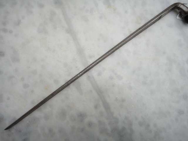 Wenn ich den Klingenansatz anschaue, könnte es sich um ein französisches Bajonett M 1847 handeln siehe Foto), was jedoch die Verjüngung anbetrifft, bin ich ebenfalls ratlos.