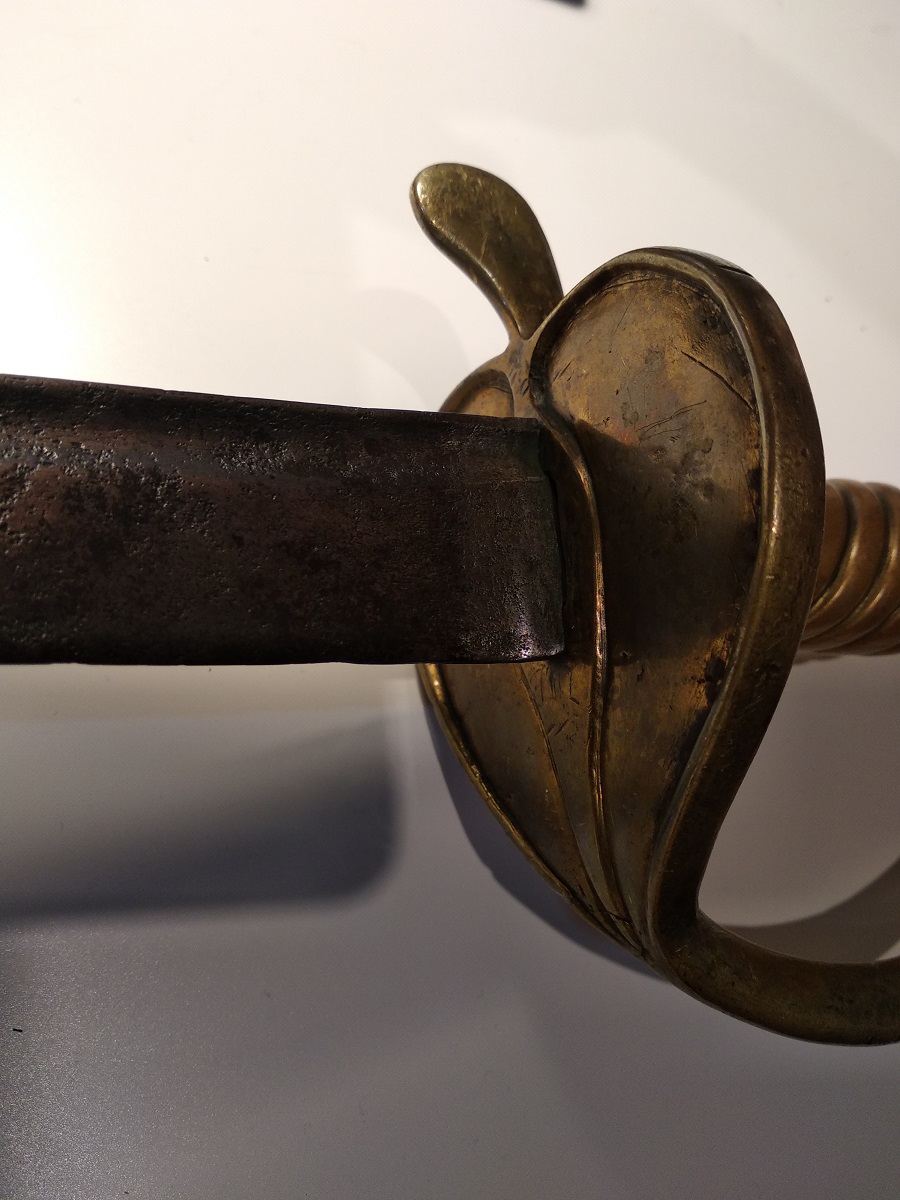 ich bin hier neu, deshalb wollte ich zuerst Alle Forum-Benutzer begrussen. Ich bin allerdings mehr Historiker als Sammler, aber ich habe solche Infanterie-Sabel in meinem besitz. Es sieht so aus, das sie fast genau wie diese von mario gemacht ist. Unterer Griffring, Hülse, oberer Griffring und der Knauf ist aus einem Stück gegossen (etwas besser bearbeitet, als bei mario's, aber mit extra guss in zwei Punkten bei dem Herz). Das Messing von dem Griff und von dem Herz sehen ein bischen anders aus - Herz geht in gelb, Griff mehr in rot (das sieht man ziemlich gut in Fotos). Ganze Sabel ist ungefahr 72 cm lang, Klinge 58 cm, 3 cm breit. Leider ohne irgendwelche Markierung und Gravierung (Klinge war hard mit Sandpapier poliert, leider...).