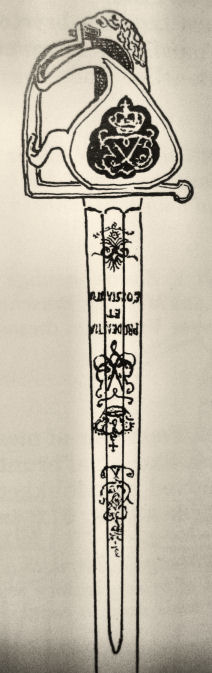 Gerade, zweischniedige Klinge. Messinggefäß mit F 5 - Spiegelmonogramm (Friedrich V., "der Gute", 1746-1766 König von Dänemark und Norwegen usw.). Griff mit Messingdrahtwicklung. Der dänische Schwertfeger J.C. Herring montierte 3.400 Pallasche, die Klingen hierfür erwarb er im Ausland. Länge: 99,6 cm.