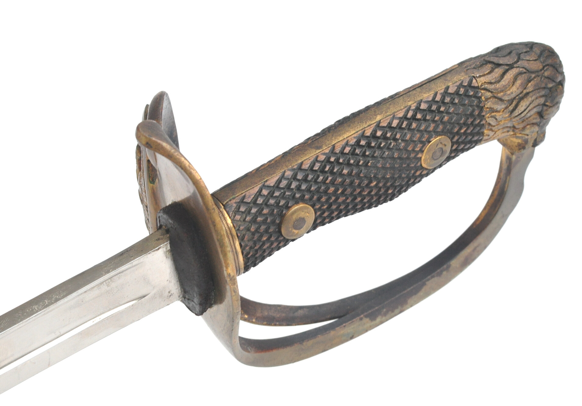 vergoldetes Messingbügelgefäß mit einem Seitenbügel in Stichblatt übergehend,