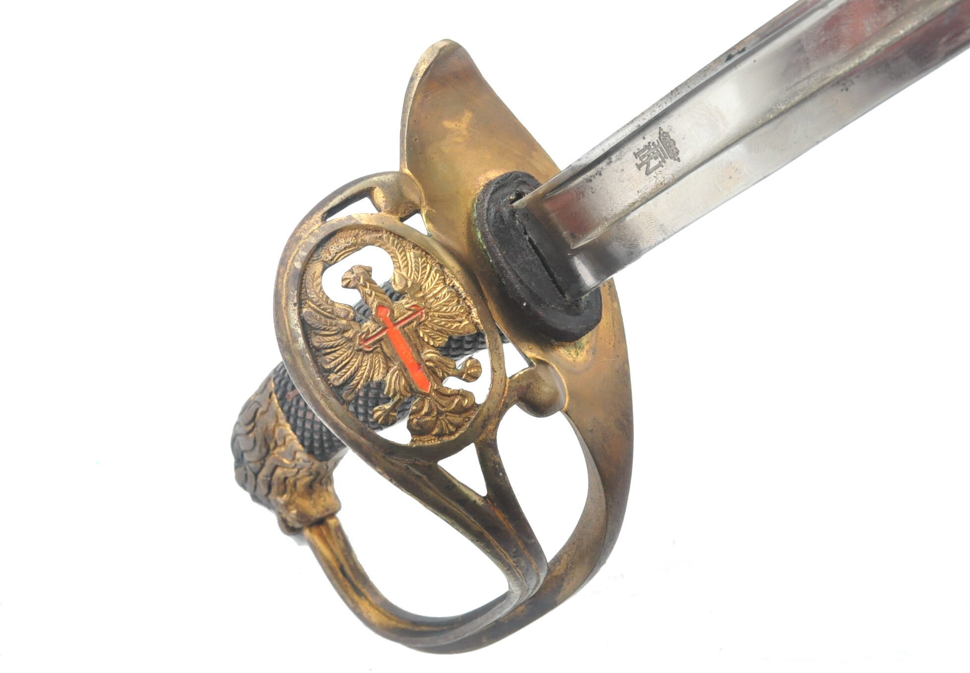Wappen mit gekröntem Adler und rot lackiertem Schwert auf der Brust