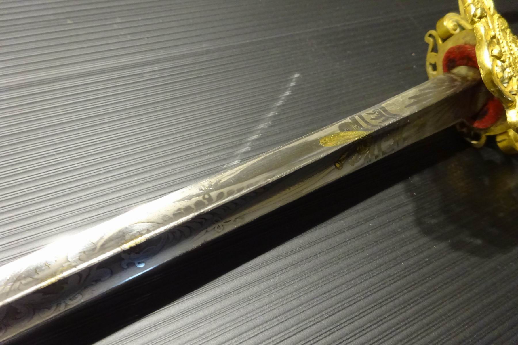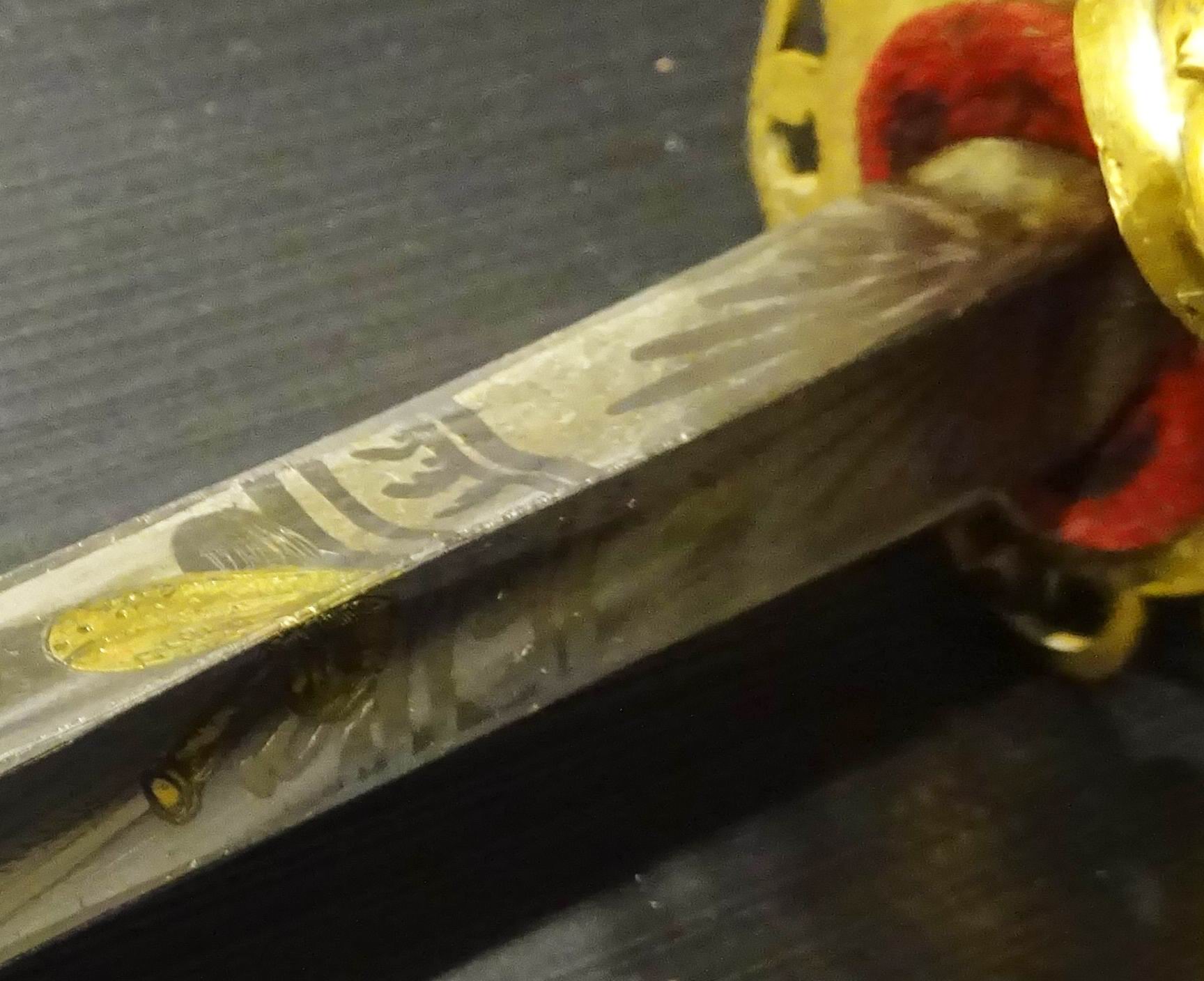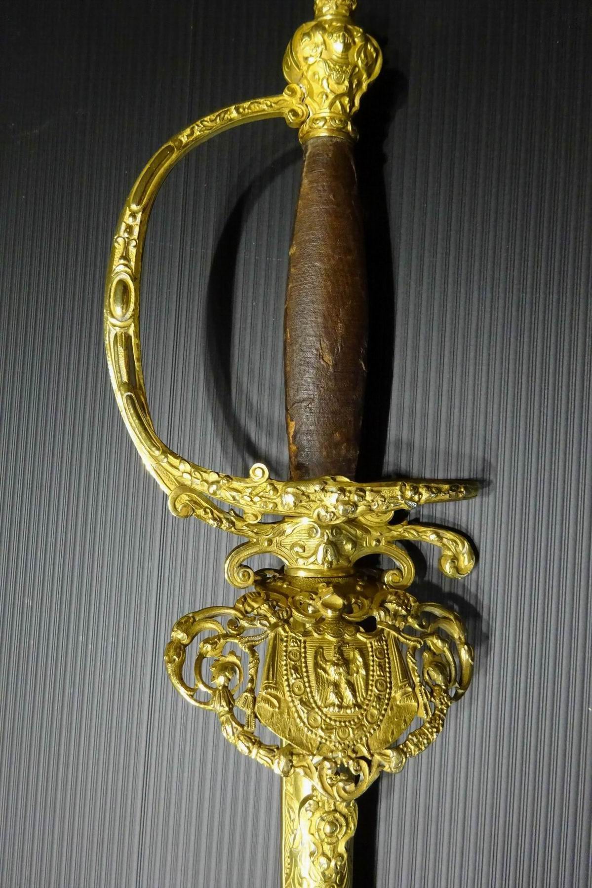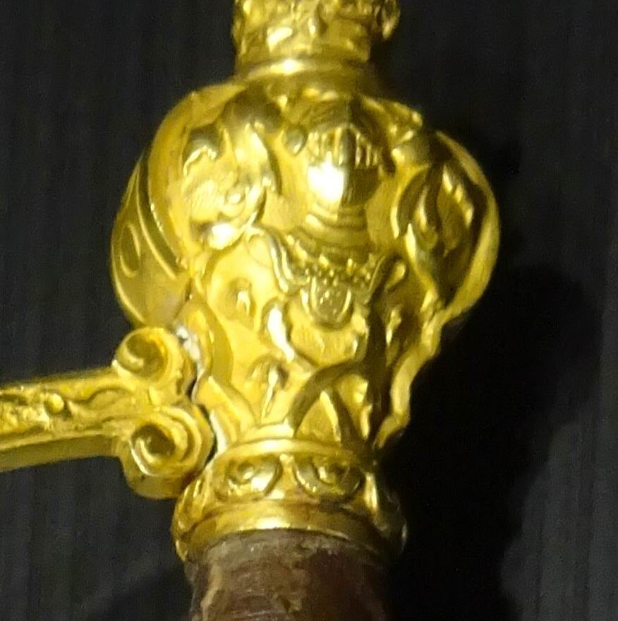 Der Degen hat eine Dreikantklinge mit Gold Elementen.Der Griff müsste eine Silberdraht Wicklung haben ( ist leider nicht vorhanden )
