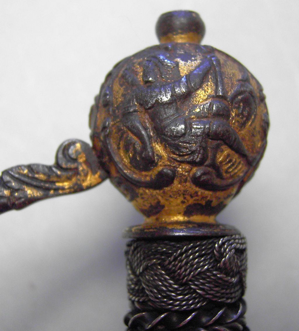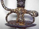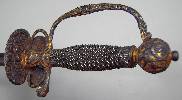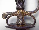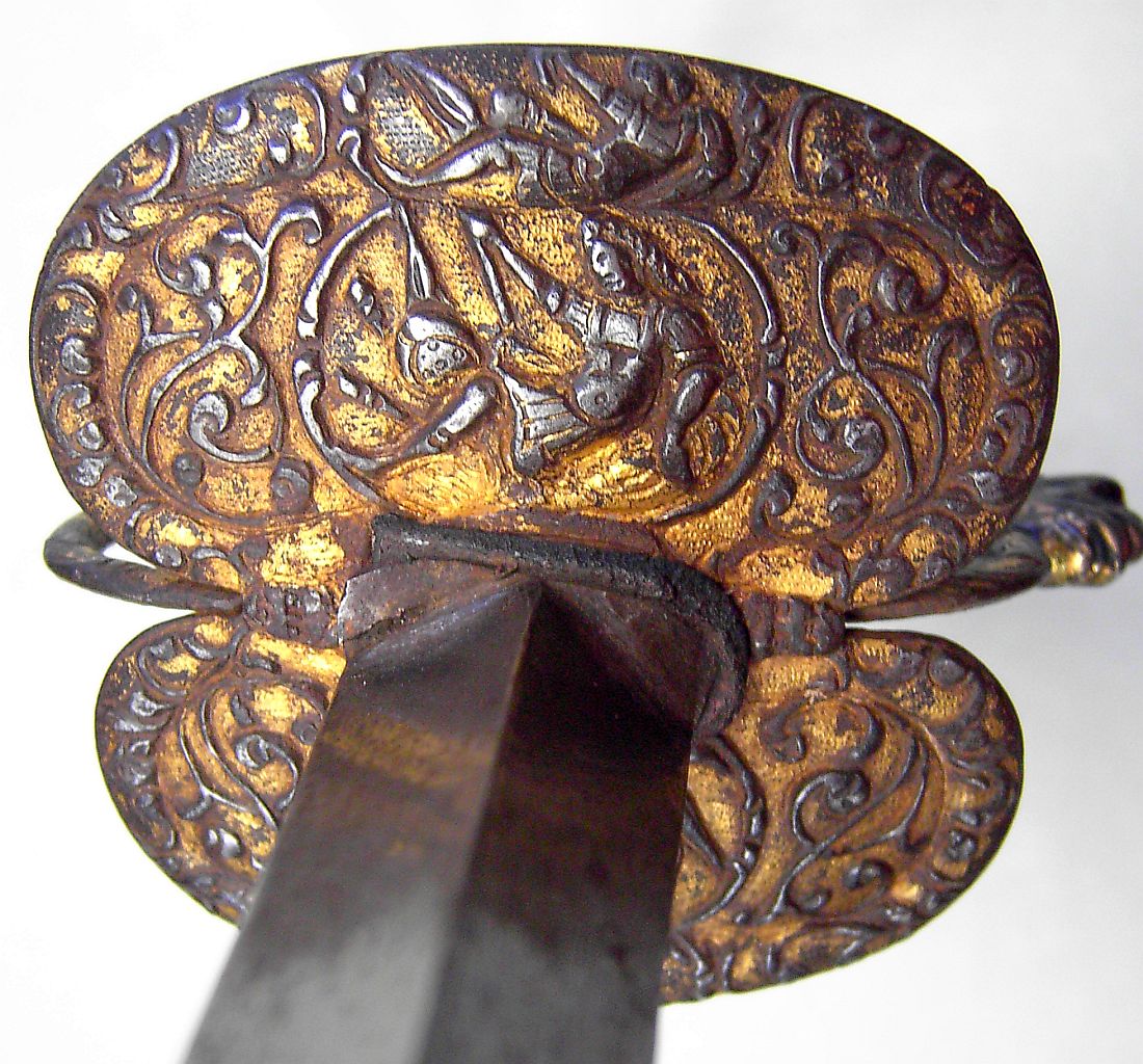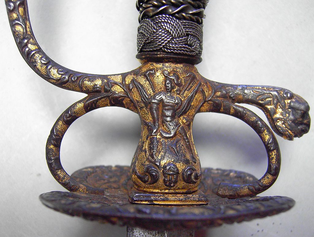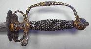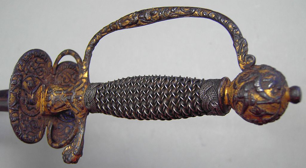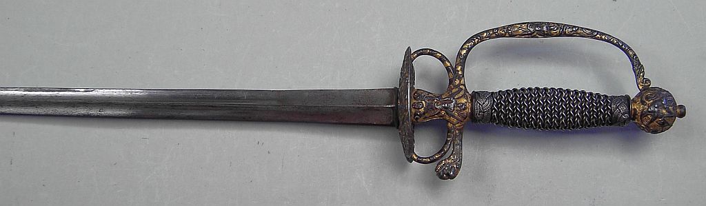 Ich möchte hier einen sehr aufwändig gearbeiteten französischen Galanteriedegen vorstellen, bei dessen Betrachtung man sich vorstellen kann, wie mühevoll die Arbeit des Handwerkers gewesen sein muss, der dieses Gefäß dekoriert hat. Auf Grund der großen Öffnungen der Fingerbügel, die tatsächlich zum Durchfassen mit Zeige- und Mittelfinger geeignet sind, unterscheidet sich das Stück deutlich von Degen mit bis zum Ende des Jahrhunderts immer kleiner werdenden Fingerbügeln, die dann um 1800 endlich ganz verschwinden.