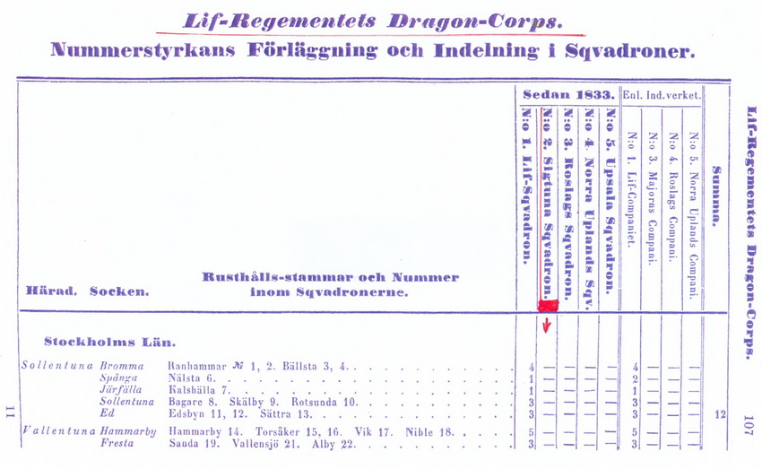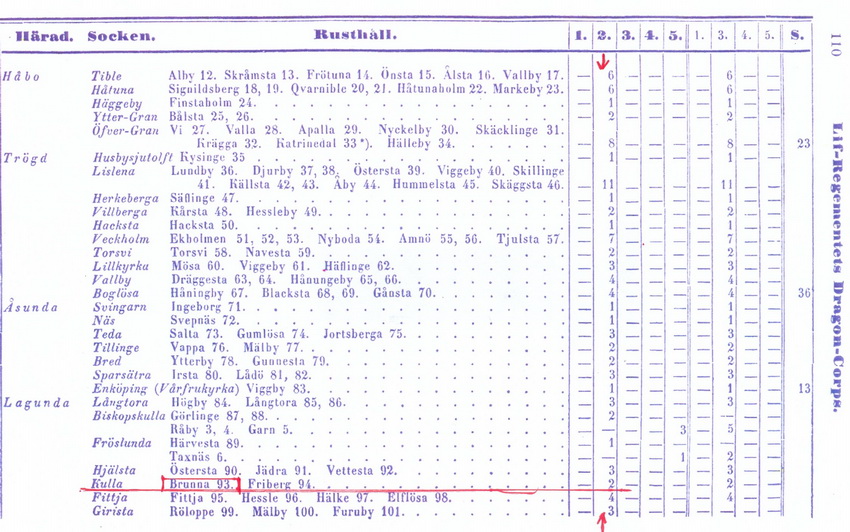 Es muss also in der Tabelle nach "Brunna" gesucht werden. Alles andere ergibt sich, wenn man die Tabelle rückwärts studiert. Das wäre natürlich nicht genau möglich, wenn in dem Ort zwei oder drei Reiter gelebt hätten. Hier passt es jedoch. In Brunna lebte der Reiter Nummer 93 der Sigtuna Schwadron. Der Ort liegt im Kirchspiel Kulla, Kreis Lagunda, im Bezirk Stockholm.