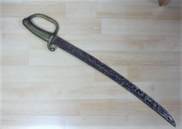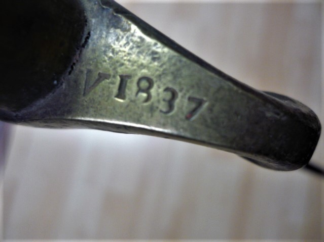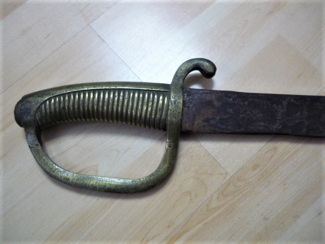 Das dürfte der "neu"-preußische Infanteriesäbel M 1818 sein. Dieses Muster geht zurück auf den französischen Sabre Briquet M 1801 und wurde in vielen deutschen Staaten sowohl bei der Armee als auch der Gendarmerie und auch von Beamten getragen. Meist stammte der diesbezügliche Bestand aus der Kriegsbeute von 1815, wurde aber auch in Solingen neu gefertigt. Verwendung fanden diese Säbel im gesamten 19. Jahrhundert, ihre Datierung ist meist schwierig, wenn nicht gerade, wie beim vorliegenden Stück eine Jahreszahl vorhanden ist.