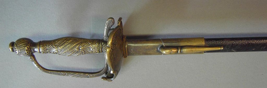 Mein mit 80 cm recht kurzes Stück hat einen abgerundeten Ort und eine belederte Metallscheide mit Messingbeschlägen. Höchstwahrscheinlich handelt es sich um einen österreichischen(?) Zöglingsdegen