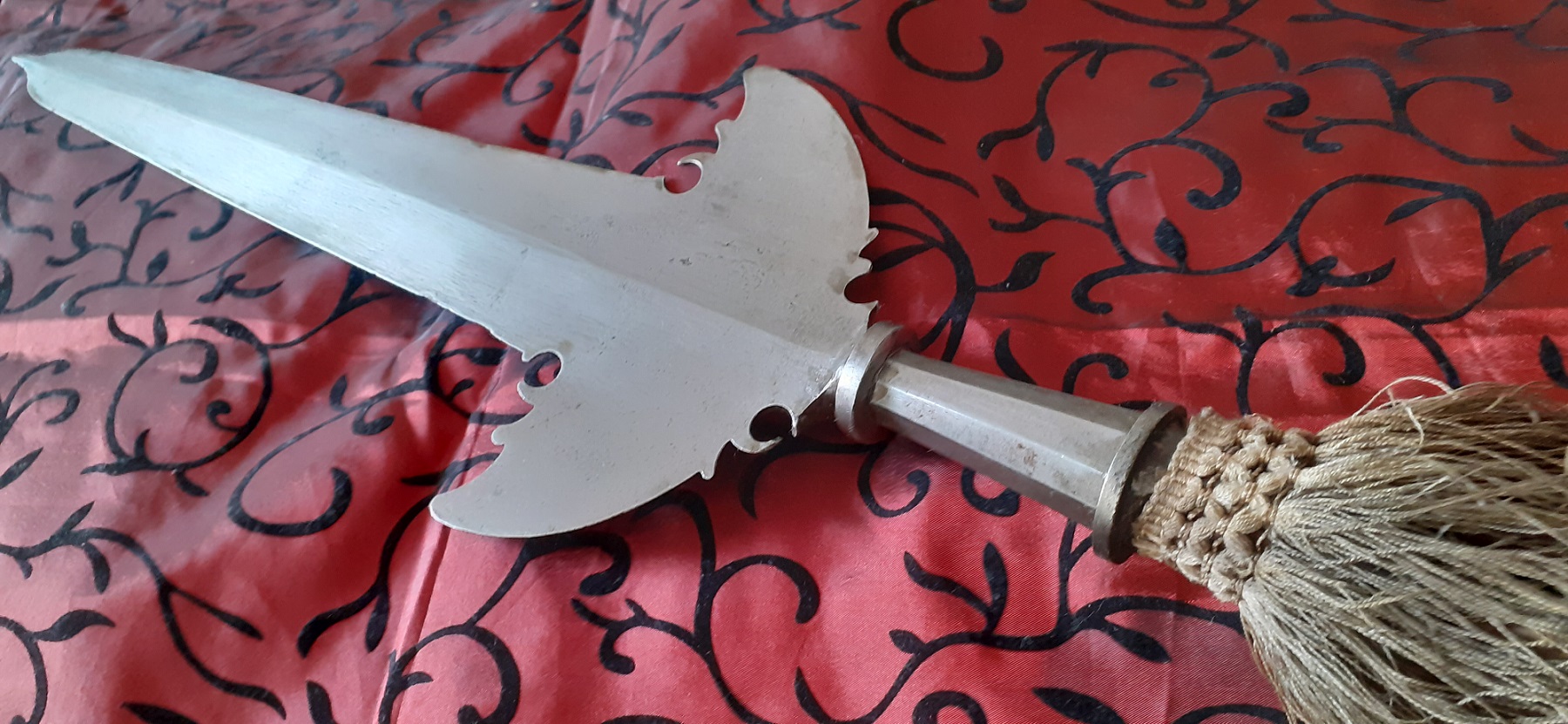 Die sehr spitze Klinge hat in der Mitte einen Grat und ist beidseitig scharf geschliffen. Dekor ist darauf nicht zu erkennen.