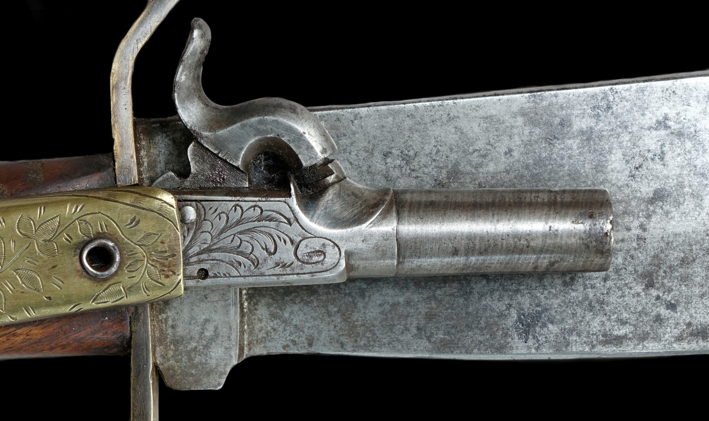 Bei diesen kleinen Kastenschlosspistolen klappt der Abzug erst beim Spannen des Hahnes aus dem Gehäuse heraus.