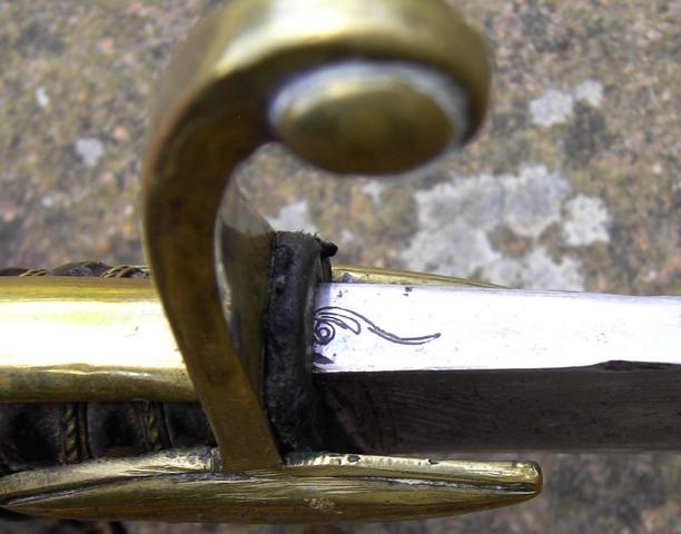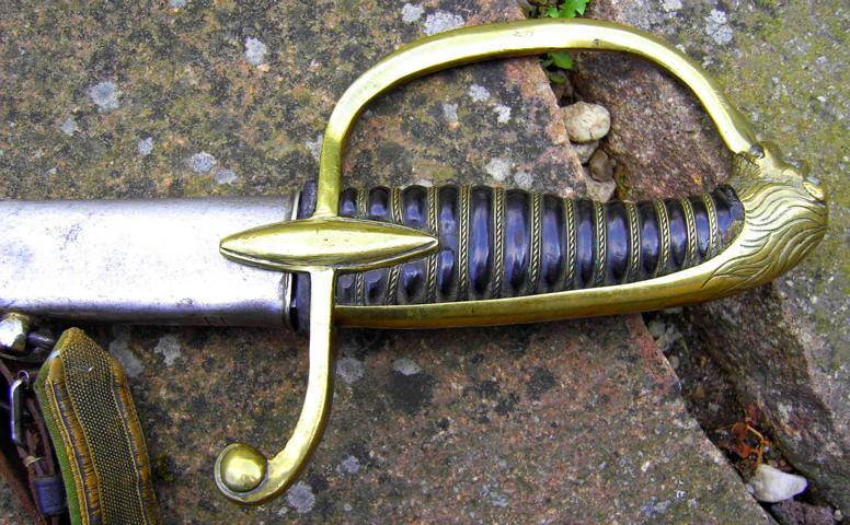 Ich bitte um Identifizierung des nachfolgend gezeigten Säbels. Am Klingenrücken direkt an der Parierstange die "Solinger Rose" und passend dazu am Schlepper die Buchstabenkombination "K&S" für Kirschbaum & Schimmelbusch. Gegossenes Messinggefäß mit Löwenkopf, Handbügel in Parierstange übergehend, beidseitig lanzettförmige Mitteleisen, Hilze aus Horn(?) mit dreifacher Messingdrahtwicklung.Gebbogene Rückenklinge mit beidseitiger Hohlbahn und Ort im Klingenrücken. Eisenscheide mit drei eisernen Beschlagteilen - Mundblech, Mittelstück und Ortblech - zwei bewegliche Trageringe. Zugehöriges, komplettes Gehänge mit Messingschnallen und Stempel "J 129 " (eventuell Kasseler Fundus?).
