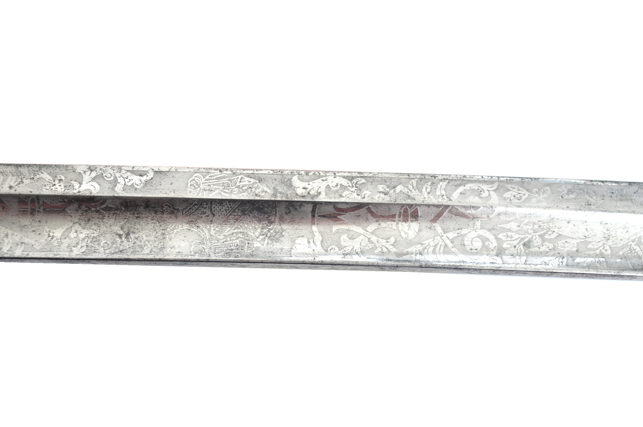 Klingenrücken und Klinge beidseiting mit floralen Ornamenten geätzt