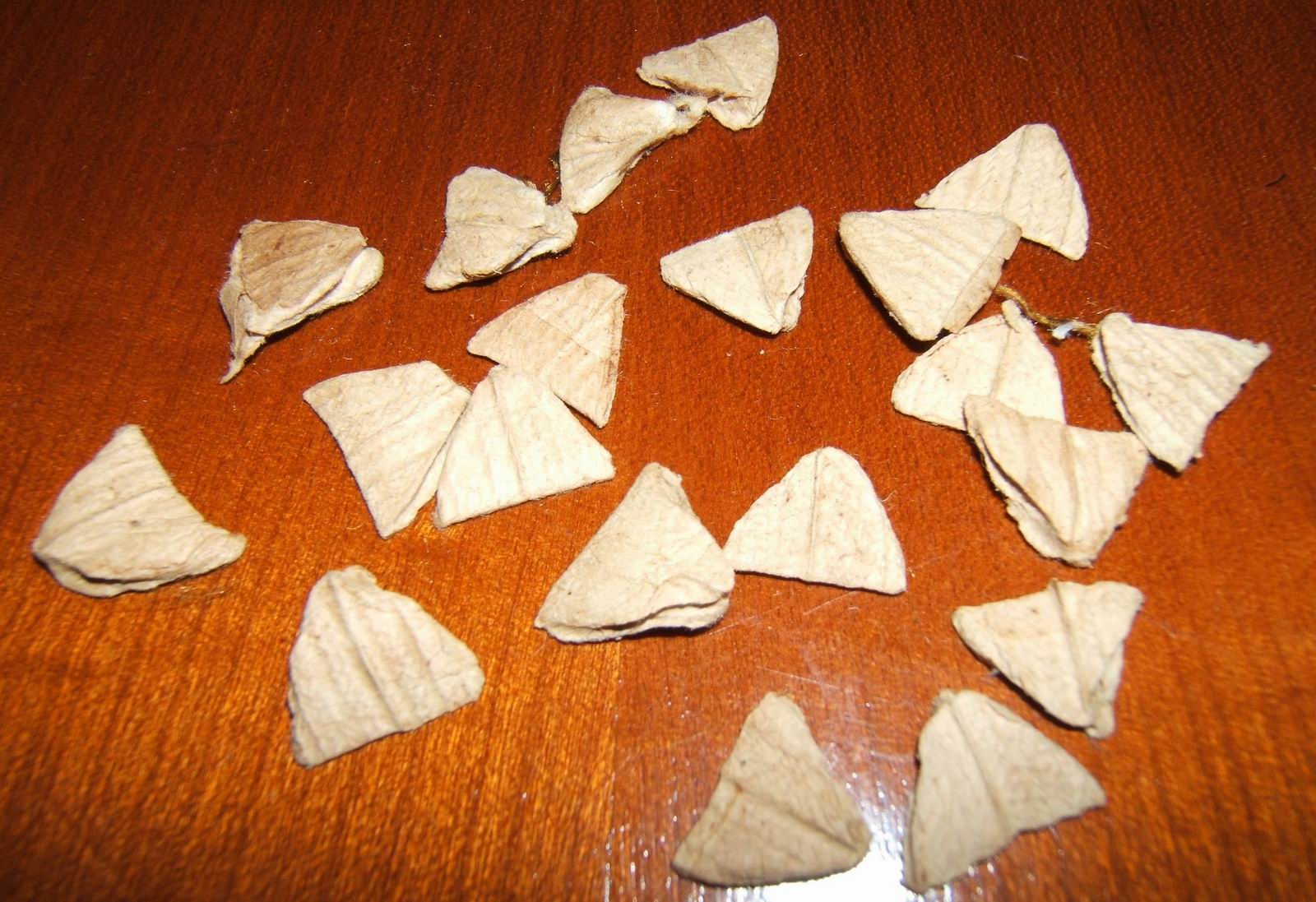 Mit dabei war etwa die Hälfte der Hishigami (Papierdreiecke). Um die Gleichmäßigkeit der neuen Wicklung zu erreichen wurden die alten Hishigami aber verworfen und durchweg durch neue ersetzt, die ich aus Eierkarton ausgeschnitten habe. Benötigt werden in diesem Fall 40 komplette und etwa 8 halbierte Stücke, letztere für den Bereich an den Menuki. Die